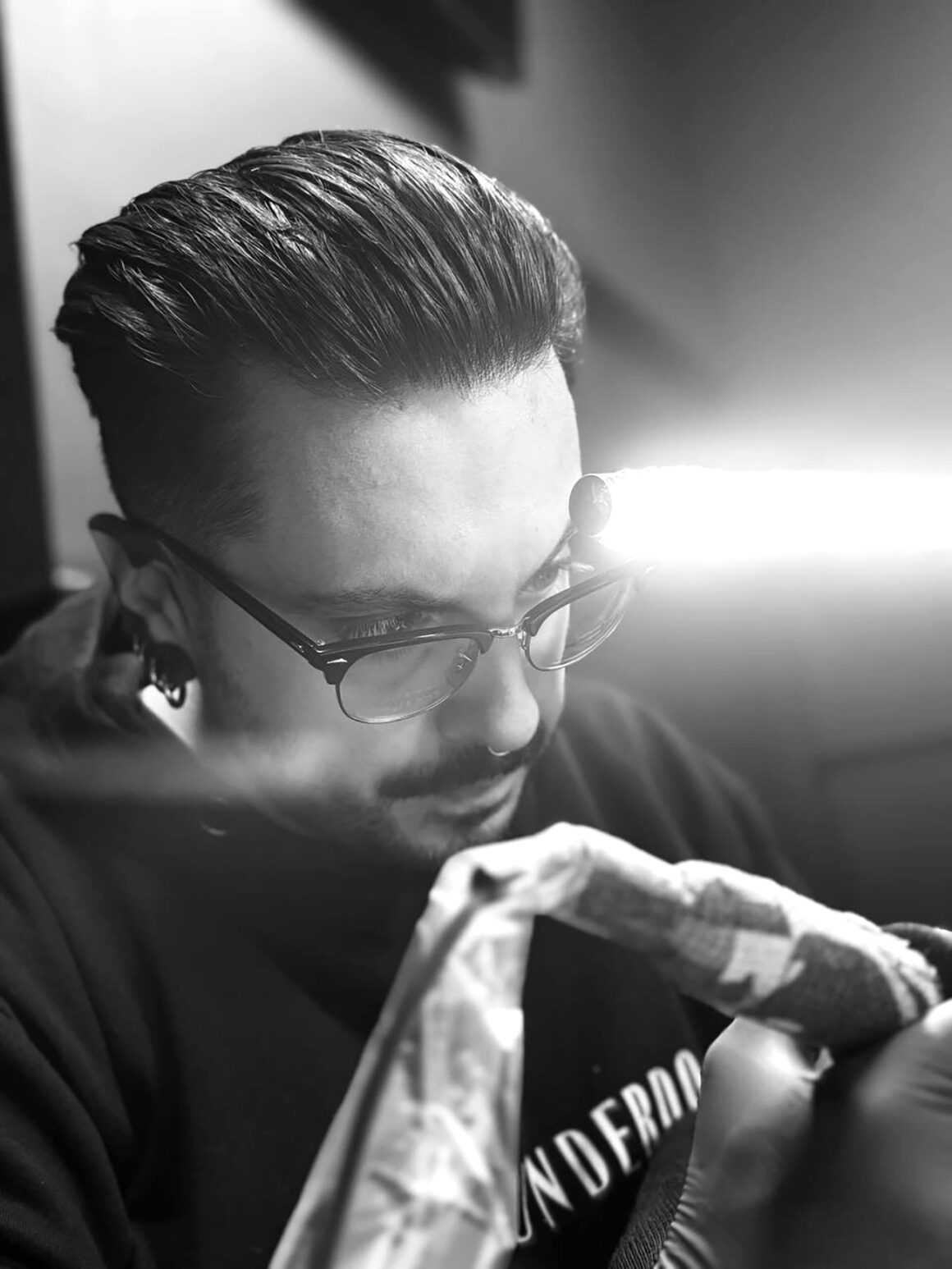 Eduardo (IG: @eduardo_cuadros_tattoo) si è unito al gruppo praticamente da subito, insieme a Giulia (IG: @giuliariva_art). Lo avevo incontrato qualche anno prima durante un seminario e mi aveva colpito immediatamente per le sue qualità. Avevo intuito il suo potenziale e direi di non essermi affatto sbagliato. Sono stato molto felice di averlo avuto qui fino a un anno fa quando – com’è giusto che sia – ha aperto il suo nuovo studio: il ‘Novem Tattoo Studio’ (IG: @novem9_tattoo).