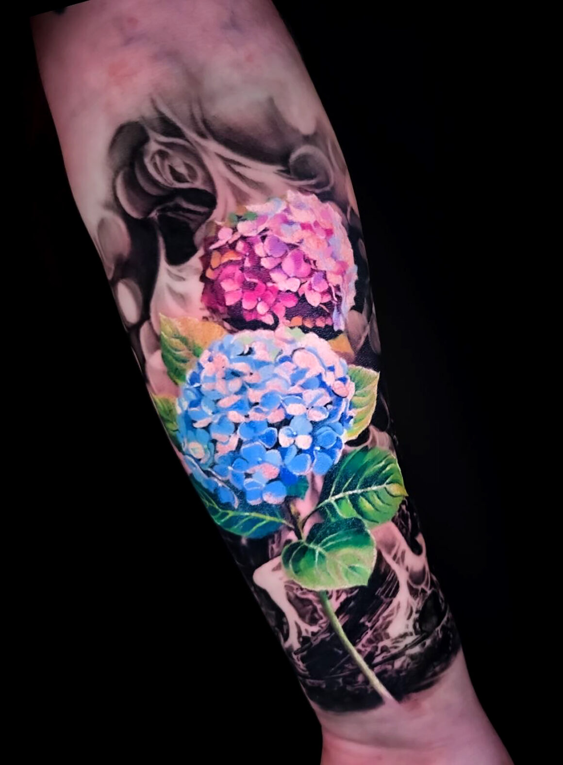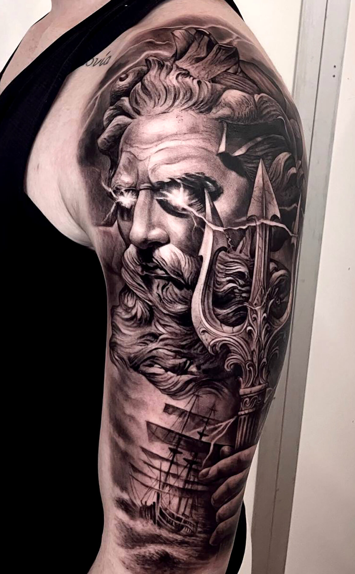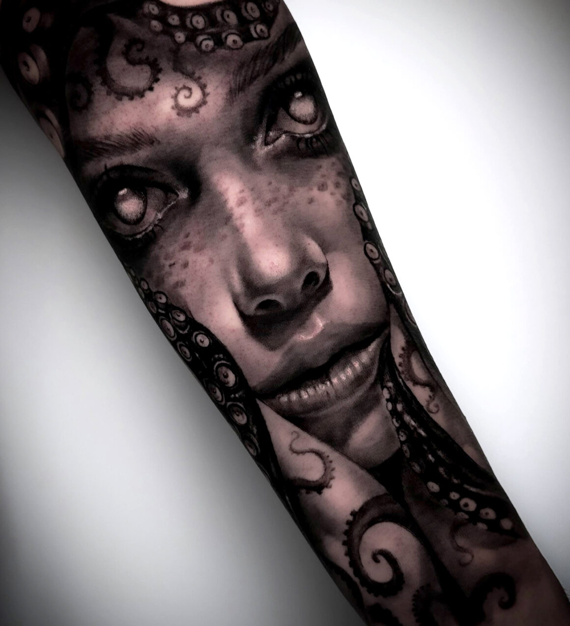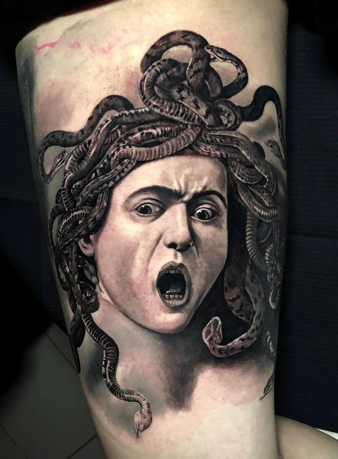 Oltre a essere un tatuatore eccezionale, è una persona affidabile, pacata e riflessiva, con un carattere speciale con cui mi sono sempre trovato in sintonia. Giorgio (IG: @ giorgiofoiadelli_art), invece, si è unito al gruppo come guest pochissimi mesi dopo gli stessi Giulia ed Eduardo. All’epoca era specializzato in NeoTraditional e Fine Line, ma nel corso degli anni ha scoperto di essere molto portato per lo stile Realistico. Diciamo che ho fatto abbastanza fatica a convincerlo, perché lui era l’ultimo a crederci… Eppure mi fa piacere avergli dimostrato che si sbagliava.