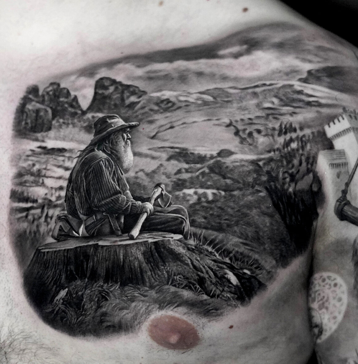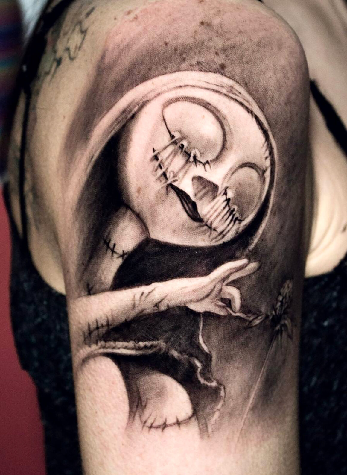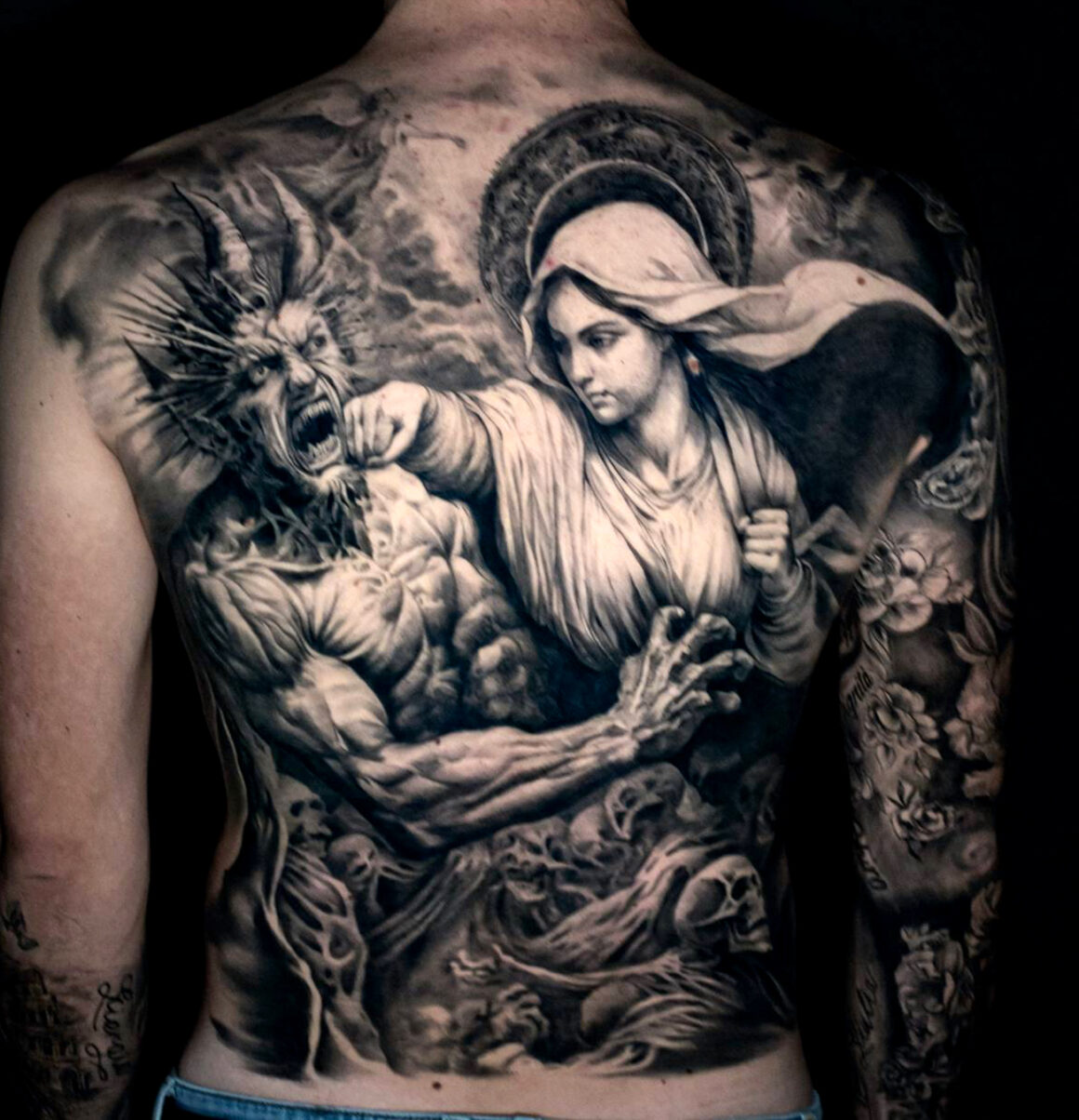 Alessio era arrivato subito dopo la pandemia per completare lo stage per l’abilitazione sanitaria. Trascorso quel periodo, ha scelto di tornare spesso come guest perché si era instaurato un bel rapporto di amicizia tra di noi. Sono contento che da qualche mese anche lui sia diventato titolare di uno studio dove abita, vicino ad Ascoli Piceno, vale a dire l’ ‘Underdog Tattoo Studio’ (IG: @underdog___tattoo). Dal carattere testardo e cocciuto, Alessio è comunque un grande lavoratore, semplicemente instancabile; credo di aver contribuito molto alla sua formazione professionale più che artistica, e questo mi fa piacere. Artisticamente è un po’ visionario, ma secondo me sta ancora cercando di capire quale sarà la sua strada. Come gli ho sempre detto, non deve sforzarsi di trovarla: quando sarà il momento, si accorgerà che quella famosa strada la sta già percorrendo.