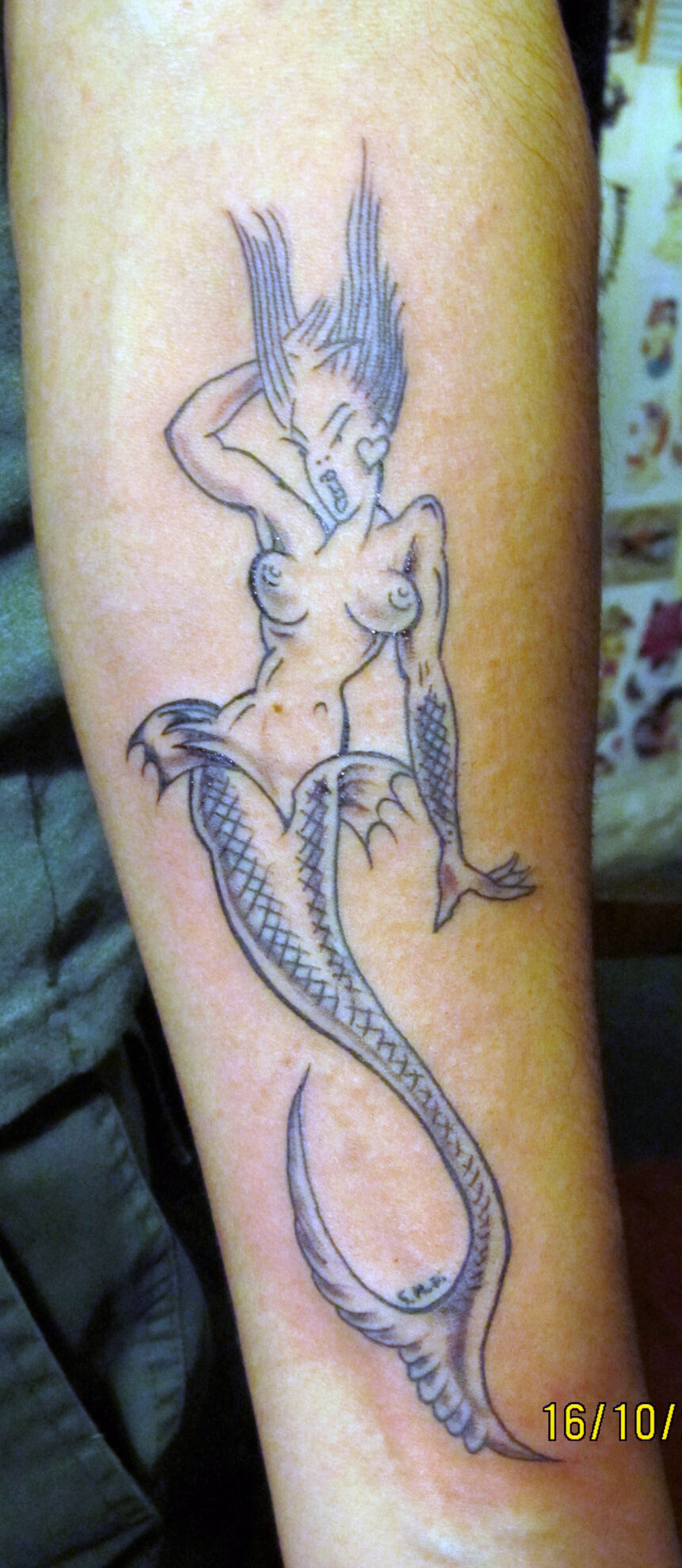 Perché sono come la calligrafia di una persona: capisci se uno è isterico, i suoi turbamenti etc. Gli outline per me devono avere un’energia della madonna. E l’energia in un tatuaggio ben fatto, anche se piccolo, deve avere la sua grinta. Una sirenetta di un centimentro e mezzo deve trasmettere qualcosa, una volontà. E diverrà più importante e potente di una schiena intera. Io mi emoziono a guardare i tatuaggi che parlano. Ti racconto questa: una volta in stazione a Napoli c’era un uomo sdraiato sul marciapiede: dalla manica della camicia gli spuntava un tatuaggio: pugnale e serpente e la scritta Carmela ti odio. Capivi subito perché era ridotto così questo poveretto. Un tatuaggio così ti genera un’emozione geniale. A Parigi, alla prima convention organizzata da Tin Tin, facevo parte della giuria. Si presenta un ragazzo con un fisico pazzesco, un carcerato, che sulla schiena aveva un Cristo di Dalì – quello sospeso in aria con i chiodoni – rifatto a mano sulla schiena. Il livello di grinta era pazzesco. Sono rimasto sbalordito. Ma non ha vinto lui, no, hanno scelto di fare vincere uno con una tigre su una gamba perfettissima. Ecco, così cominciava la decadenza del tatuaggio. Guarda ad esempio Pollock: guarda il diverso uso dei pennelli, anche quando versa le latte vedrai che c’è dell’intensità anche lì. È il gesto che conta, lòa grinta che usi, la passione. Pollock non arriva mai all’autocompiacimento. Così erano i tatuatori con cui mi interfacciavo allora: nessun divo, tutti con esperienza d vita e la capacità di arrangiarsi.
