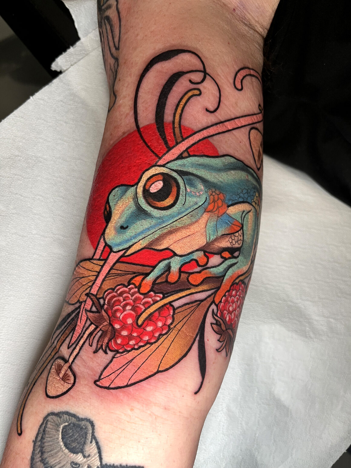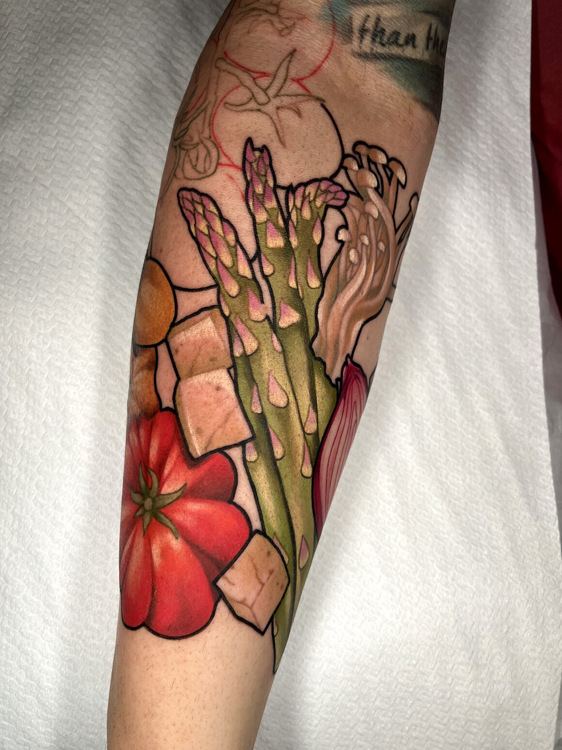 Penso di avere una naturale attrazione verso alcuni disegni più di altri, probabilmente influenzata anche da ciò che vivo fuori dalla sfera lavorativa. Per esempio amo mangiare, ho lavorato per anni in cucina e, non a caso, adoro tatuare il cibo. (sorride) In qualche modo credo che anche i miei viaggi influenzino le mie scelte, anche per ciò che riguarda la scelta dei colori.