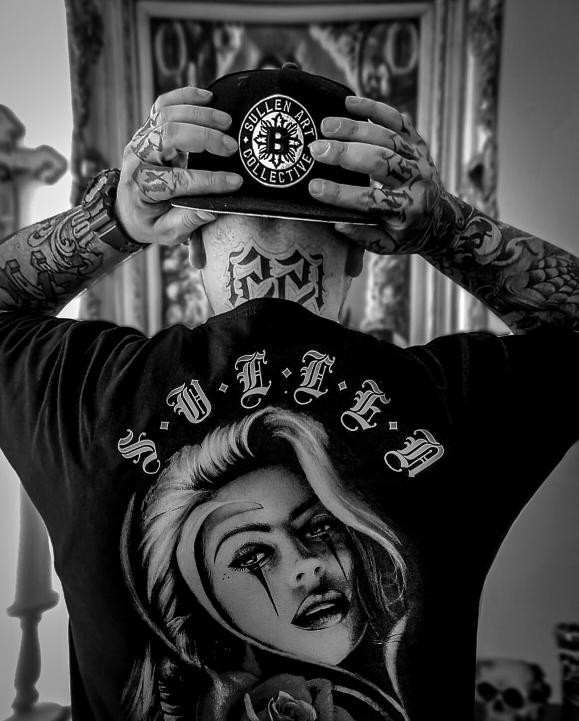 Ah, quel giorno non lo dimenticherò mai! Di notte mi scrive la Sullen (precisamente Color Crime) e mi dice: “Abbiamo visto un tuo progetto: ti piacerebbe se lo mettessimo su di una nostra maglietta?”. Beh, dirti che sono impazzito è poco! (ride) Quello era uno dei miei obbiettivi primari. In realtà ce n’è anche un altro, ma ora non sto svelartelo visto che sono molto vicino a realizzarlo… Quando dicono che la Sullen (IG: @sullenclothing) sia come una famiglia è proprio vero: ci sentiamo quasi tutti i giorni, loro sono molto presenti in queste cose e ti fanno sentire un vero professionista.